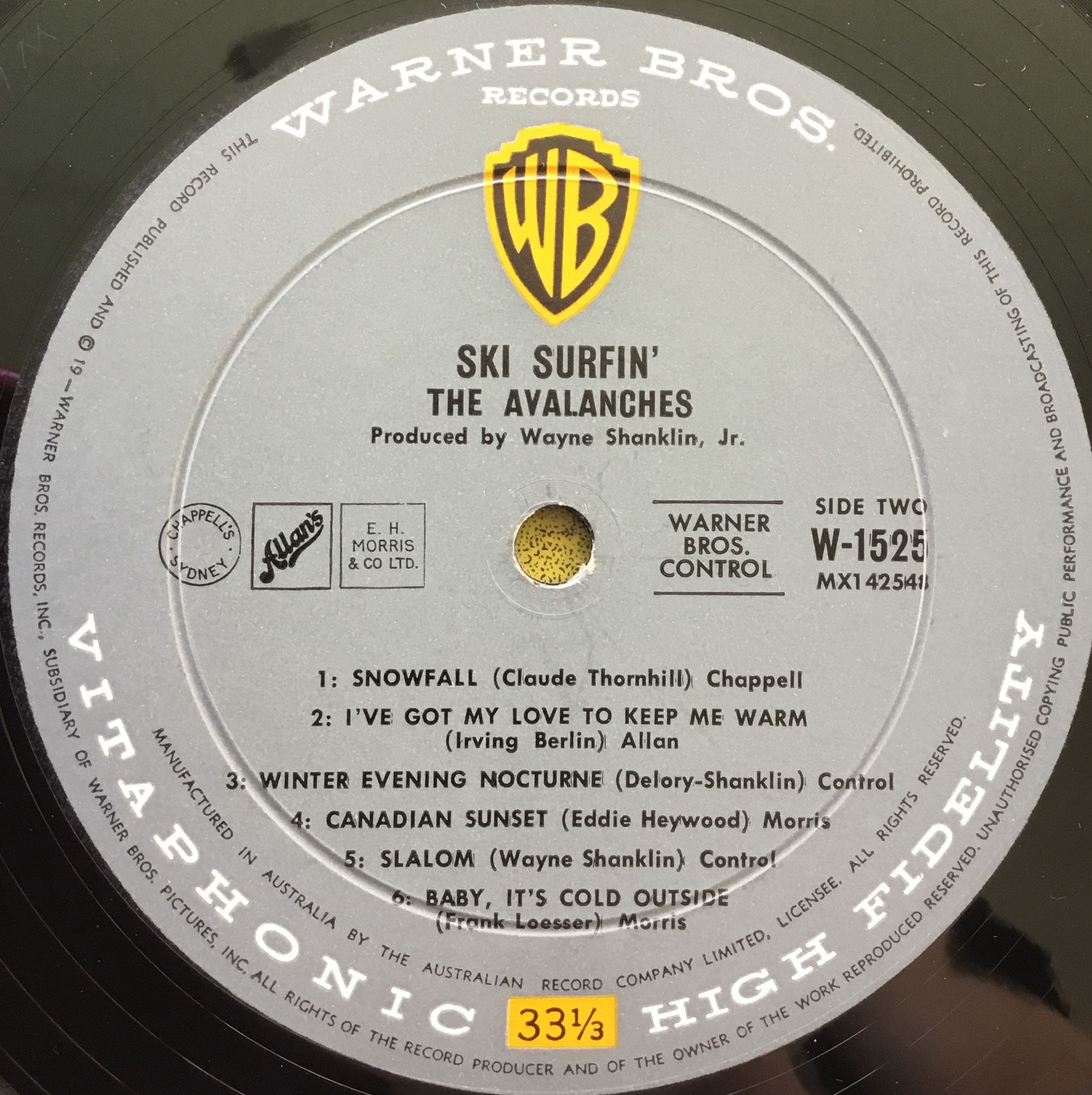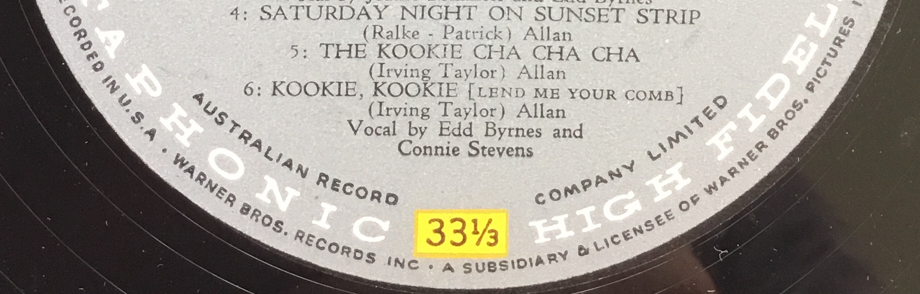 The grey label features a black and yellow WB shield logo. Variations on this logo come and go over the following decades. For the first decade WB was manufactured by the Australian Record Company Limited. They’re credited in the third row of text from the bottom (just above Vitaphonic High Fidelity).