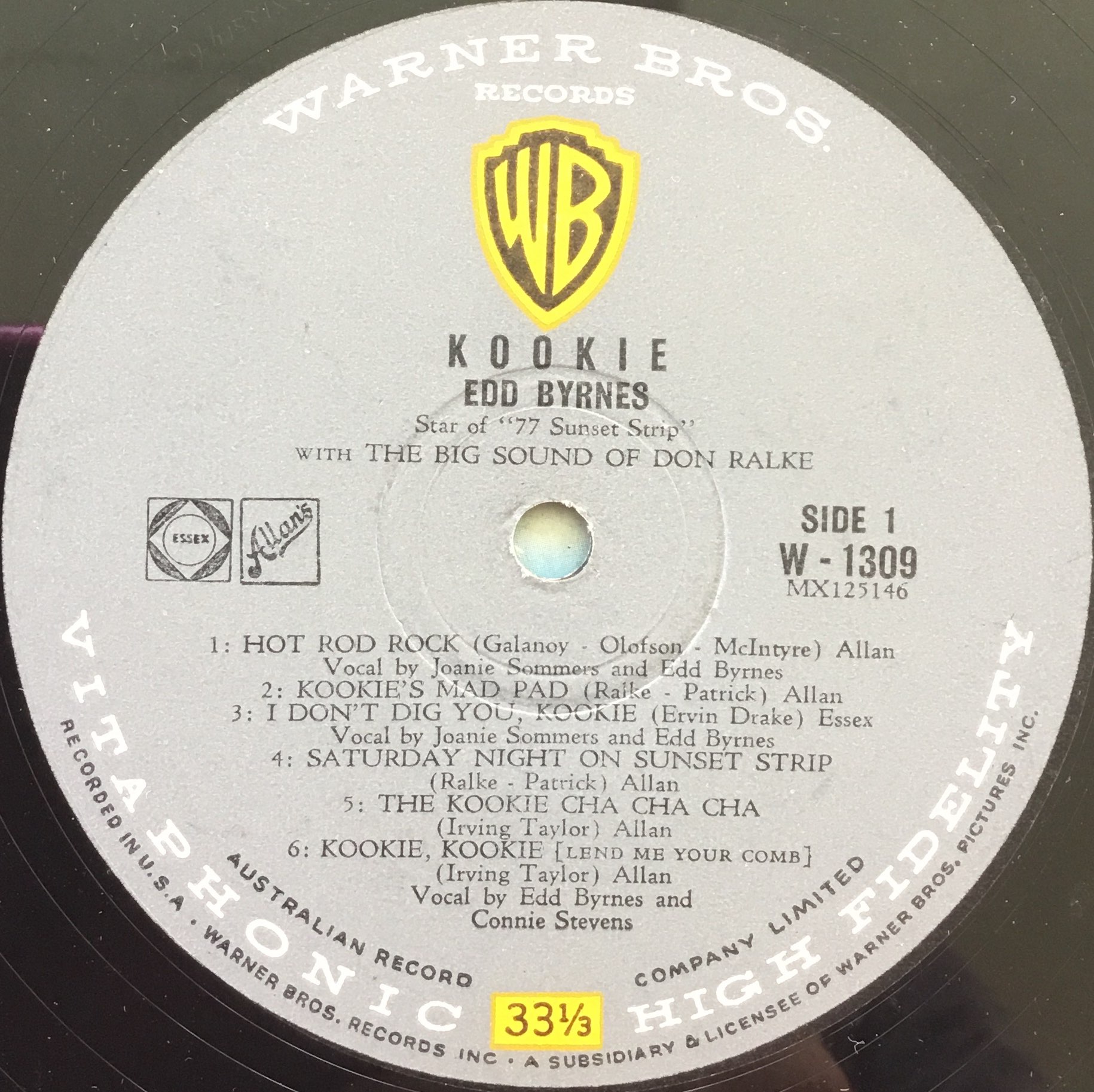 The Outriggers LP is an early stereo pressing from the 60/61 period. It was originally released in the U.S in 1958. Note the catalogue number 1224 is lower than 1309 for the Kookie LP above. For the next decade Australian releases were selected from the broader U.S WB catalogue and not always issued in the same order as the U.S.