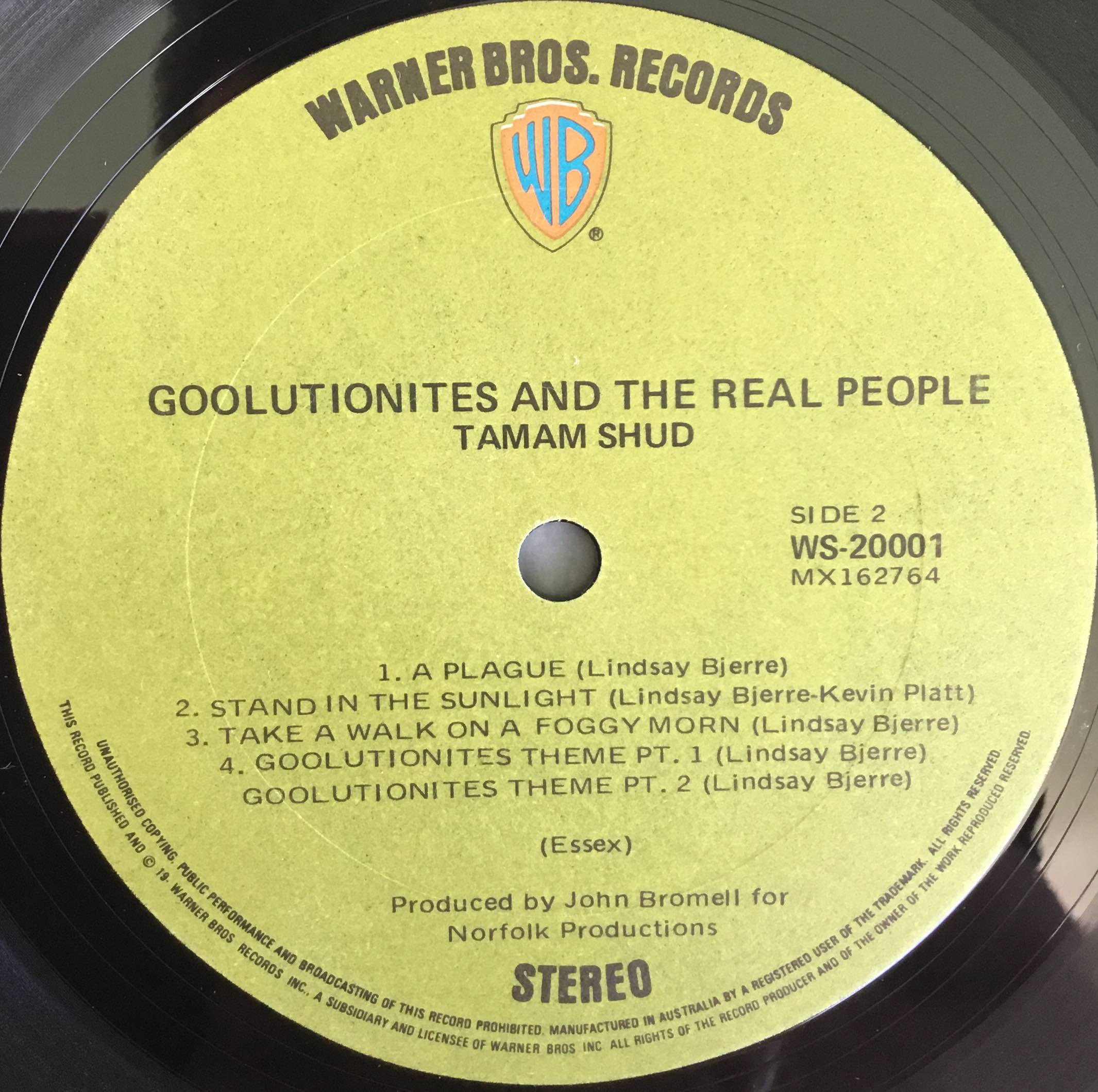 The first local act to release an LP on the new label was Tamam Shud with Goolutionites And The Real People (WS-200001), which came out in late 1970. The label highlights the changes in design with Warner Bros. Records along the top and the WB shield logo featured below it.