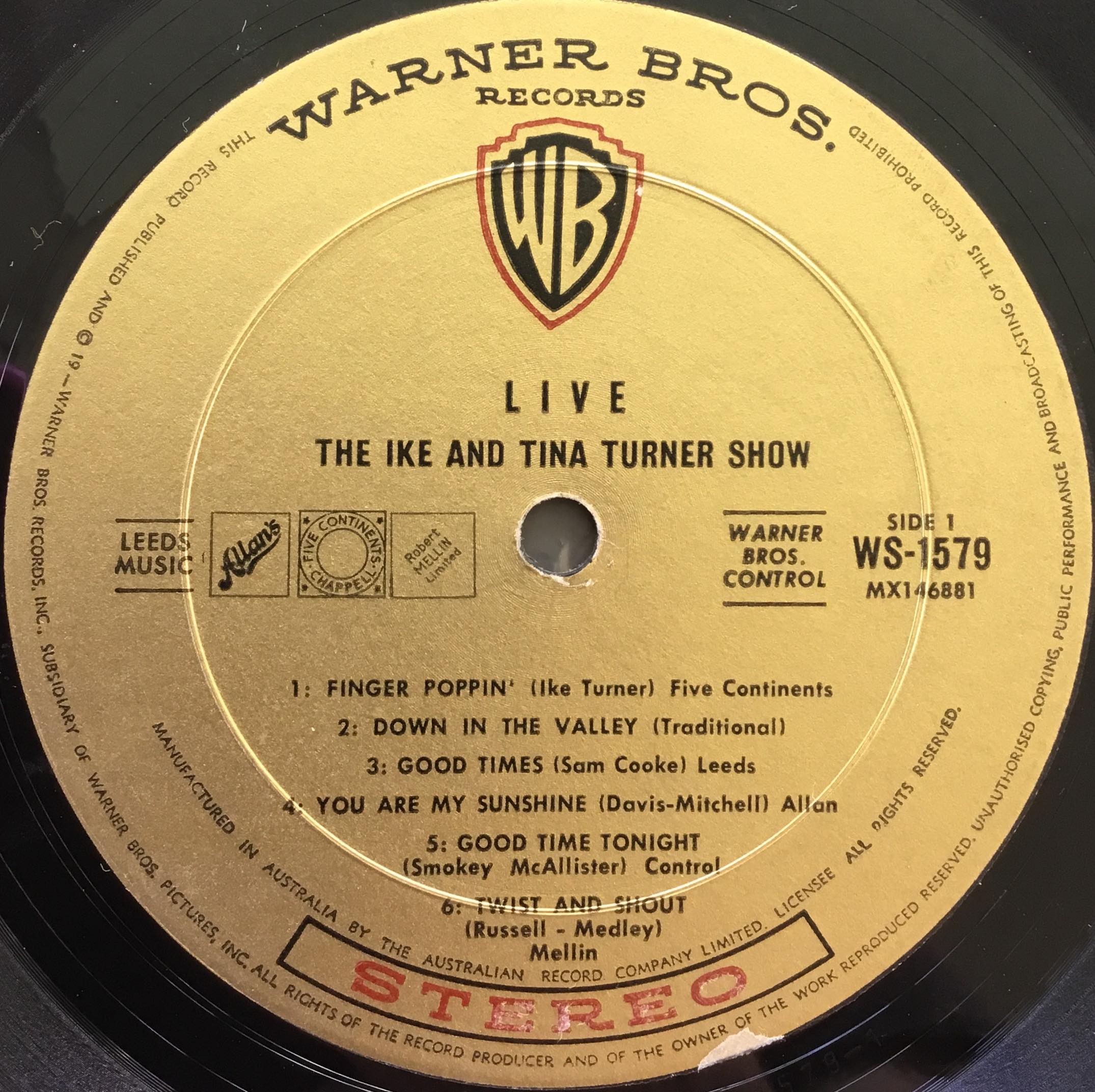 By April 1966 the label had changed to gold. Ike & Tina Turner’s Live Show (W 1579) is an early example. The album was released in the U.S early in 1965 and the sleeve of the Australian pressing carries a © date of 1965. However, reviews don’t begin appearing in Australia until April 1966 suggesting WB delayed local release.