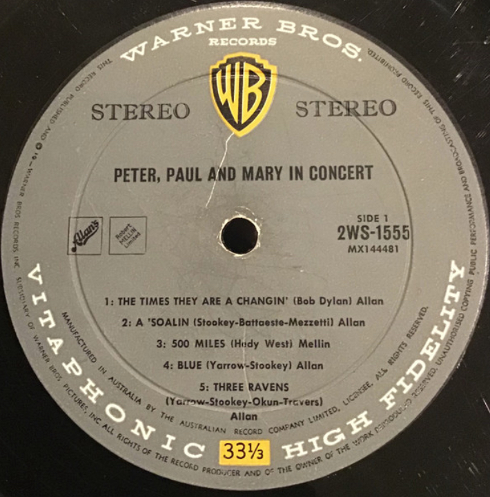 Interestingly, LPs like the debut by Peter, Paul & Mary, which was certainly issued in Australia by January 1963, were also issued with the updated text. This suggests that there were multiple pressings of at least this LP in the first year of its release.