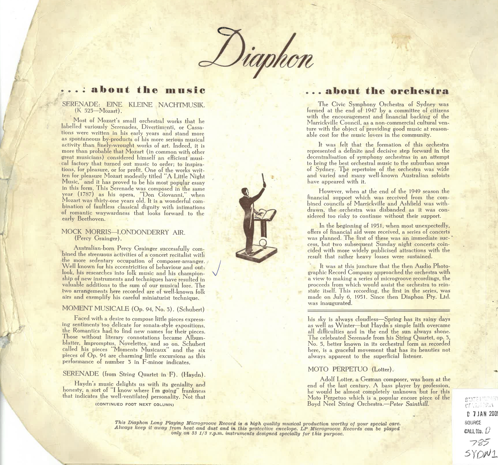 The Civic Symphony Orchestra was a bold experiment led by a talented and innovative conductor. Haydn Beck and the councils of Marrickville, Ashfield, and Ryde saw a great opportunity to bring music to their constituencies, but their efforts were stifled by limited pubic interest and financial backing. However, their first recordings remain as testament to their vision, and as a reminder of the early days of the recording industry in Australia. Hundreds of thousands of LPs have been released in the 68 years since the release of the first Diaphon LP, but Haydn Beck’s debut record with the Strings of the Civic Symphony Orchestra deserves to be remembered as the first LP produced and recorded in Australia.