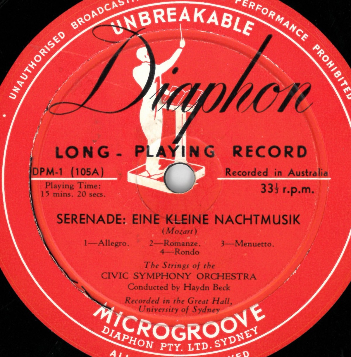 The Civic Symphony Orchestra was a bold experiment led by a talented and innovative conductor. Haydn Beck and the councils of Marrickville, Ashfield, and Ryde saw a great opportunity to bring music to their constituencies, but their efforts were stifled by limited pubic interest and financial backing. However, their first recordings remain as testament to their vision, and as a reminder of the early days of the recording industry in Australia. Hundreds of thousands of LPs have been released in the 68 years since the release of the first Diaphon LP, but Haydn Beck’s debut record with the Strings of the Civic Symphony Orchestra deserves to be remembered as the first LP produced and recorded in Australia.