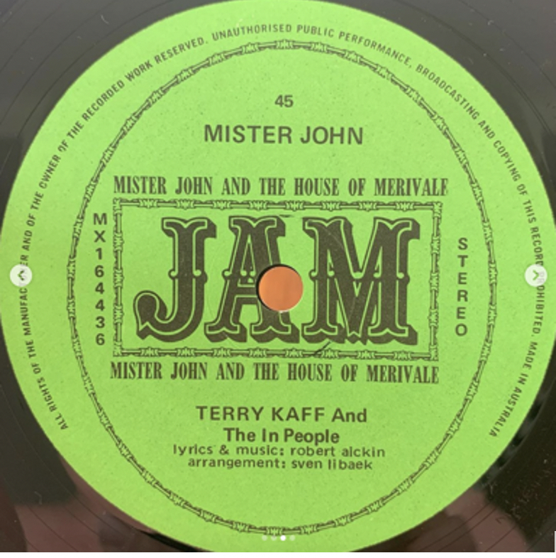Terry Kaff: I joined the In People in 1970 after being the original singer with the ‘Mike Perjanik Complex’ at ‘Jonathans’ in George Street, Broadway. What a group! When we finished there, nobody could afford the 11-piece Complex and after Tony asked me to join the In People for stints at Chequers and later, the Motor Club. How could I resist? What a super rhythm section the In People had… Robin Workman, Les Young, Bill Flemming and Chris Brown…ah, memories. I recorded a lot of Sven Libaek’s various tracks including, a request by John Hemmes for songs/tracks to promote John and Merivale store in Sydney. I mentioned to Sven that I was with the In People and we decided to do the recording with the group. As it happens, I used to frequent the store before this recording, as they had the latest original clothing gear, so I regarded it as a pleasure to do.