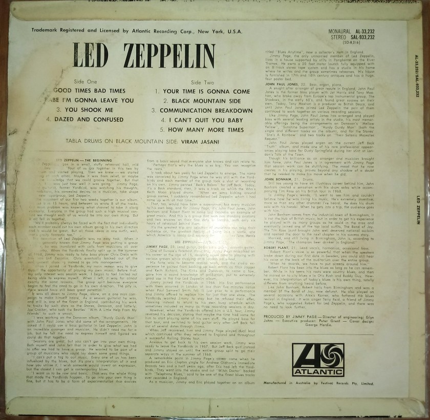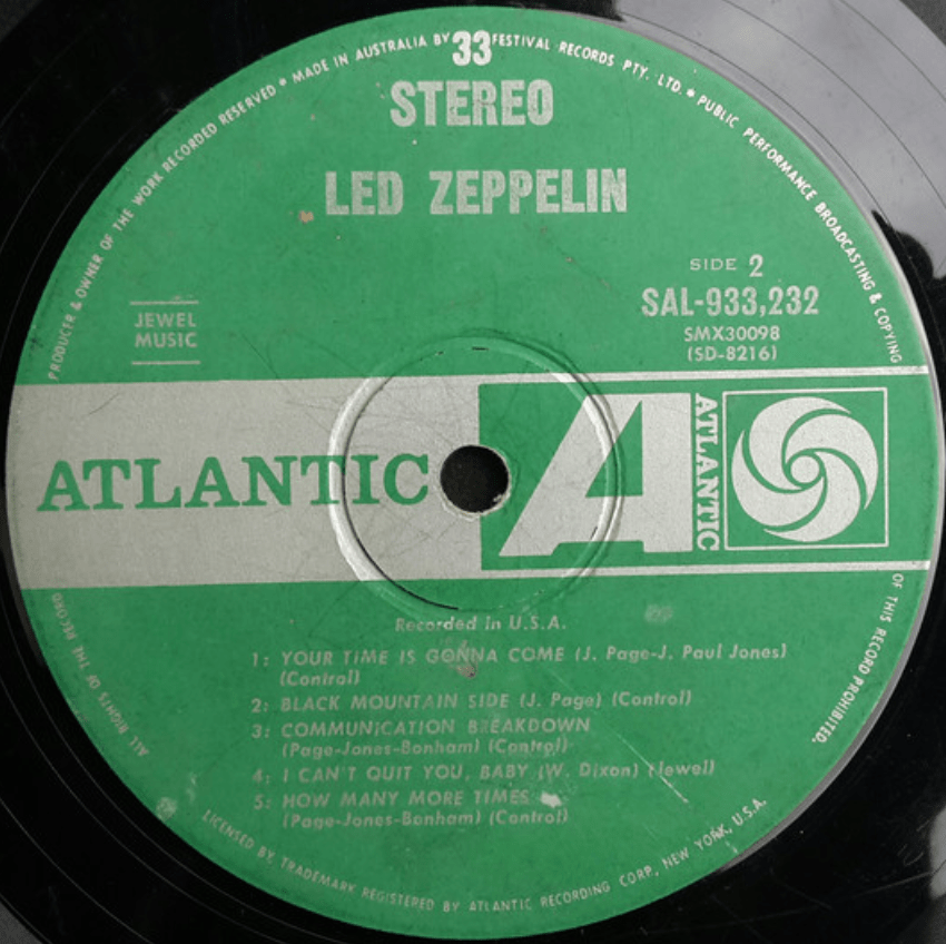 Third Australian Pressing (late 1969): Dark green and silver Atlantic Label, different slimmer font used for Led Zeppelin, catalogue number of SAL 933,232 on record label, mono & stereo numbers printed in top right corner of rear sleeve, non-flipback Festival sleeve, small Atlantic below catalogue number on label runs bottom to top.